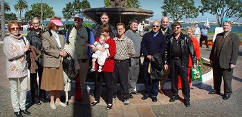 About 3 pm Amy Baxter, her husband Louis Calderon, and their daughter Jill picked us up at the park, and we and the sushi (courtesy of the U.S. Navy) and Ginny drove down to Shelter Point Marina, to the fountain in front of the Shelter Pointe Hotel where we were to meet Bill Whalen, pilot of our charter (see sandiegoboats.com for a map and additional info).
