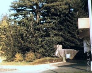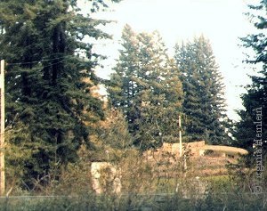 These three photos appear to be taken walking south-to-north along the frontage, far enough up the hill to get a partial view of the house, so within the property line. Mainly this series shows how much redwood trees surrounds the house. These hills are in a redwood forest. Their property had a redwood cathedral -- I'll talk about that in more detail in a later picture