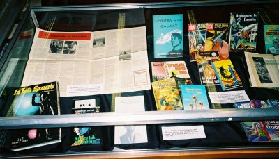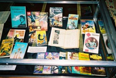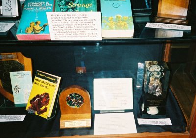 This is one of Heinlein's 'Hugo corners' in the vertical display cases, with the Hugo, first edition and paperback of Stranger taking center stage, flanked by Starship Troopers and The Moon Is a Harsh Mistress. In the back is a poster print of a number of mostly mid-1950's cover art.