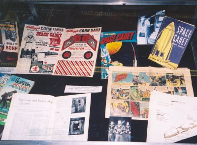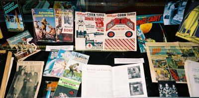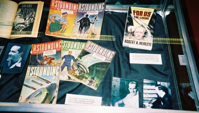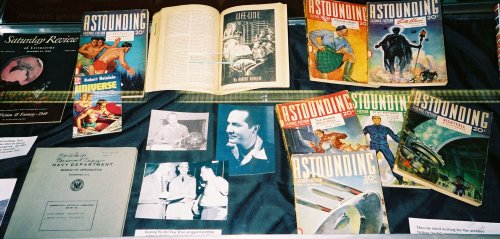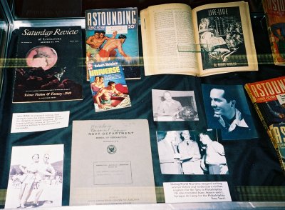 1939 to 1949. The open pulp is Astounding with Heinlein's first story, "Life-Line," in August 1939. In addition one of several versions of the famous picture of him together with L. Sprague de Camp and Isaac Asimov at the Naval Air Experimental Station in Philadelphia, there is a copy of one of his wartime reports on developing plastics for aircraft canopies. The Saturday Review contains his 1949 review of The Conquest of Space: "A Baedeker of the Solar System"