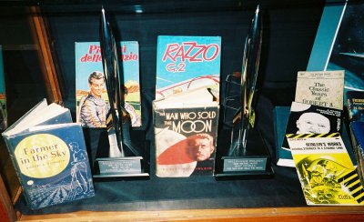 Two of the Three RetroHugos for 1950 awarded in Philadelphia in 2000: "The Man Who Sold the Moon" novelette, and Farmer in the Sky for Best Book.