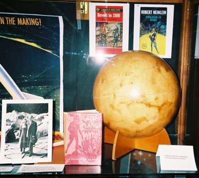 Heinlein collected planetary and sky globes. His post-Mariner Mars globe fills out the shelf, together with the special library edition of Red Planet which Scribners' started issuing in the early 1960's.
