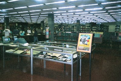 View of the Exhibit from the Library's main floor entryway. There are a couple of vertical cases on the left, outside the frame of this photo.