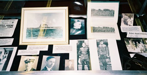 Military Heinlein: About 1924-1930. Because of the way the display was arranged, these photos "read" from left to right. Photos of Heinlein's family show all seven children about the time he graduated from high school. That thing in the bottom right part of the case is the flag belt he wore for ROTC. Just to the left are pictures from 1924 -- the photos are blowups from the book, his high school yearbook.