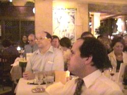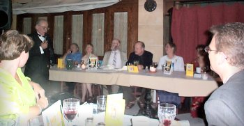 Arriving at the restaurant at 5:30 PM, there was the usual mad dash to get everything in place: Peter Scott got the AV tech squared away, Sam and Jane and everyone else cooperated in getting the place settings down, Deb and Geo, assisted ably by Jake Keaton, set up the cameras to tape the event, while Alan Milner acted as my substitute host, keeping things going, while I paid off the restaurant and the service from which we’d rented the AV equipment and set up.