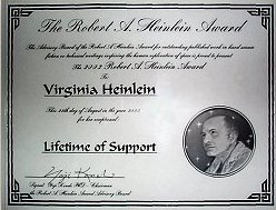 Joe Haldeman’s able assistance. Spider and Joe awarded the first Heinlein Award to Virginia Heinlein, posthumously, for her years of devoted work to publish and restore the body of Robert’s works, and her overall encouragement of man’s quest to permanently achieve space flight and colonization.