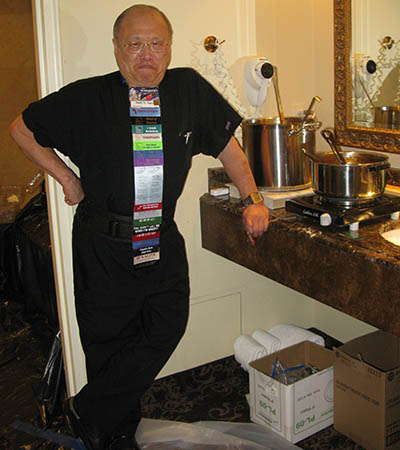 The Heinlein Society’s party was advertised for Friday night in the Historic Davenport. SFWA Grandmasters Robert Silverberg and (THS Director) Joe Haldeman, and SF author David G. Nordley attended. The party was planned around Keith Kato’s various chili recipes, but to hide that fact (cooking was theoretically not allowed in the Davenport) we only said “The Heinlein Society ‘Meet and Greet'” (not “party” for some reason related to the Davenport management’s aversion to “parties” inside the designated party hotel). Four types of chili were offered: Beef Mild, Bison Mild (the most popular), Beef Hot (Robert Silverberg admitted to Keith that for the second time in 41 years, his palate was burned out), and portabella mushroom-based Vegetarian. The usual condiments were available (saltine crackers, oyster crackers, grated cheese, chopped onions, chopped scallions, mashed avocado, black olives), as were a large veggie tray with dips, a large tray of red and green grapes, cinnamon rolls, cookies, bottled water, and sodas. Mike was the functional Door Dragon for the party, greeting entrants with a badge sticker saying “The Heinlein Society Water Brother“; Sharon answered questions about what THS was and did. Keith sat in the back near the chili and drinks, since he had spent all day in his room cooking, and his back was sore. Mike estimated 300 fans attended; doors opened at 8:00 PM, and the final die-hards were chased out at 1:00 AM. Clean-up took about an hour; extra food was donated (and picked up by) Convention Operations, and the hardware was taken back to Keith’s room. Check-out of the party suite was made at 2:30 AM, only 10½ hours after check-in. THS’s party was a tremendous success, not only by the number of attendees, but the compliments we received in subsequent days.