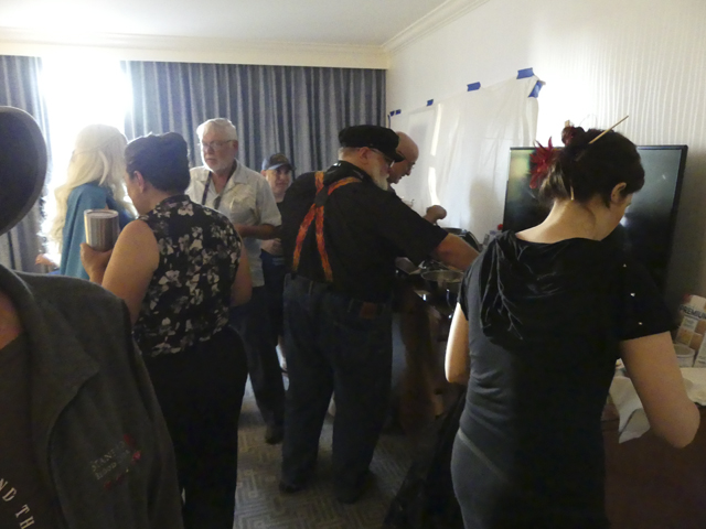 The Heinlein Society’s party was held on Friday 17 August, 18:00—Midnight, primarily a semi-closed reception for our members and invited guests, but anyone who managed to find their way in got to stay (except for one inconsiderate person on a skateboard scooter. One must have standards!). We opened on time, even with some set-up left to do.