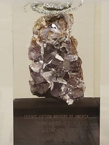Retro-Hugos. The Retro[spective] Hugo Awards ceremony was the evening of 16 August, for work published in 1942 that would have been Hugo-eligible at the 1943 Worldcon (which neither existed nor gave out Hugos). Robert Heinlein had four stories nominated in three categories, and in one category (Novella) he had himself to compete with! Heinlein nevertheless won for Best Novella (“Waldo”) and Best Novel (Beyond This Horizon), bringing his total Hugo count to 11. The Retro-Hugo vote tally is attached. Vice President-Secretary Geo Rule was asked by Art Dula of the Heinlein Prize Trust to accept on Heinlein’s behalf. For the Novella, Geo had the line of the night: “I answer for him,” and asked Spider Robinson to come up and “help” as the second acceptor, to much cheering. After the Ceremony, we all took photos with the award hardware, and Spider beamed as if they were his own. The THS gang was invited up to Spider’s suite for a celebration, where there were some really weird potato chip flavors passed around. Spider was lucky enough to keep both trophies in his room for two whole nights!