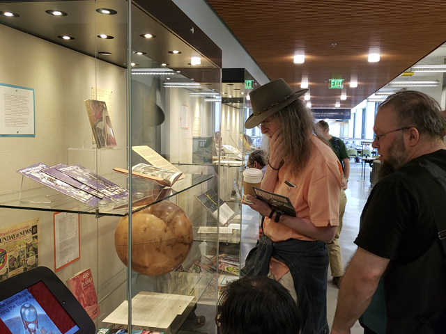 Jessica and other staff members engaged in vigorous conversation about the use of the term “sci fi” in the Exhibit. As the two very prominent SF authors in the group, Gregory Benford and Spider Robinson (both past or present Worldcon Guests of Honor), could testify, the term has had detrimental effects on authors’ sales, many SF authors do not like the term. Swayed by their eloquent testimony, Jessica said they would change the wording in the Exhibit!