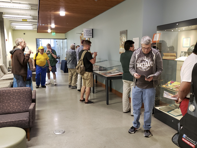 On Wednesday 15 August (the day before Worldcon officially opened), about 30 Heinleiners made their way to the campus of the University of California, Santa Cruz (UCSC), to see an Exhibit of items from the physical Heinlein Archives. After several months of planning, the group gathered at 10:30 AM in the lobby of the San Jose Hilton Hotel. Kevin Ellingwood drove part of the contingent in a rented 15-seat passenger van, while Keith Kato and John Seltzer also volunteered to drive passengers. As things worked out, Worldcon Guest of Honor Spider Robinson’s schedule allowed him to come with us, and John Seltzer (at his first WorldCon! What luck!) drove him—-basically three hours of round trip conversation, with the Guest of Honor and well-known Heinlein advocate! Mike Sheffield volunteered for special assignment—airport pickup duty. The balance of the group drove joined the caravan en route.