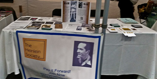 THS’s table was finally set up on Thursday August 14, and I sat there daily from 10:00-18:00 (plus and minus a bit) until breakdown on Monday at 15:00, with the aforementioned help by Brad Lyau, Gerry Nordley, and Alan Petrillo. Some other THS members (past and present) who were not known to be also dropped by to say “hello.” I was pleased to see an old friend Tina Black again, from the Kansas City Science Fiction Society and the Heinlein Centennial; she was doing duty at Site Selection.