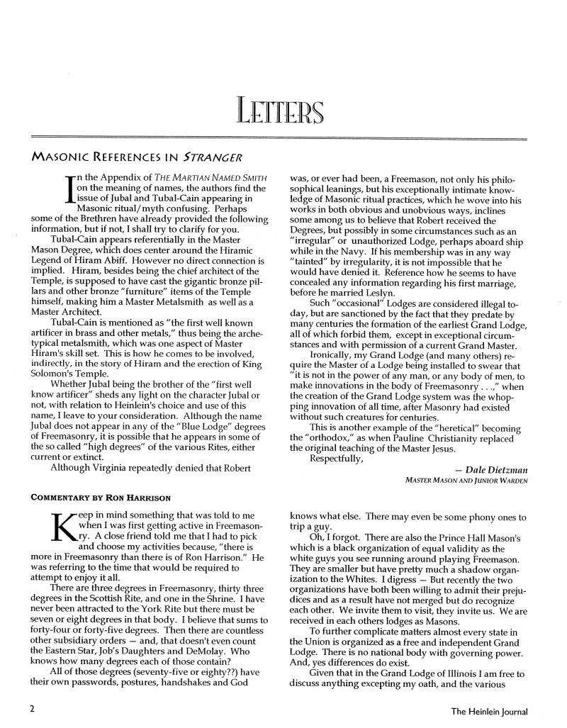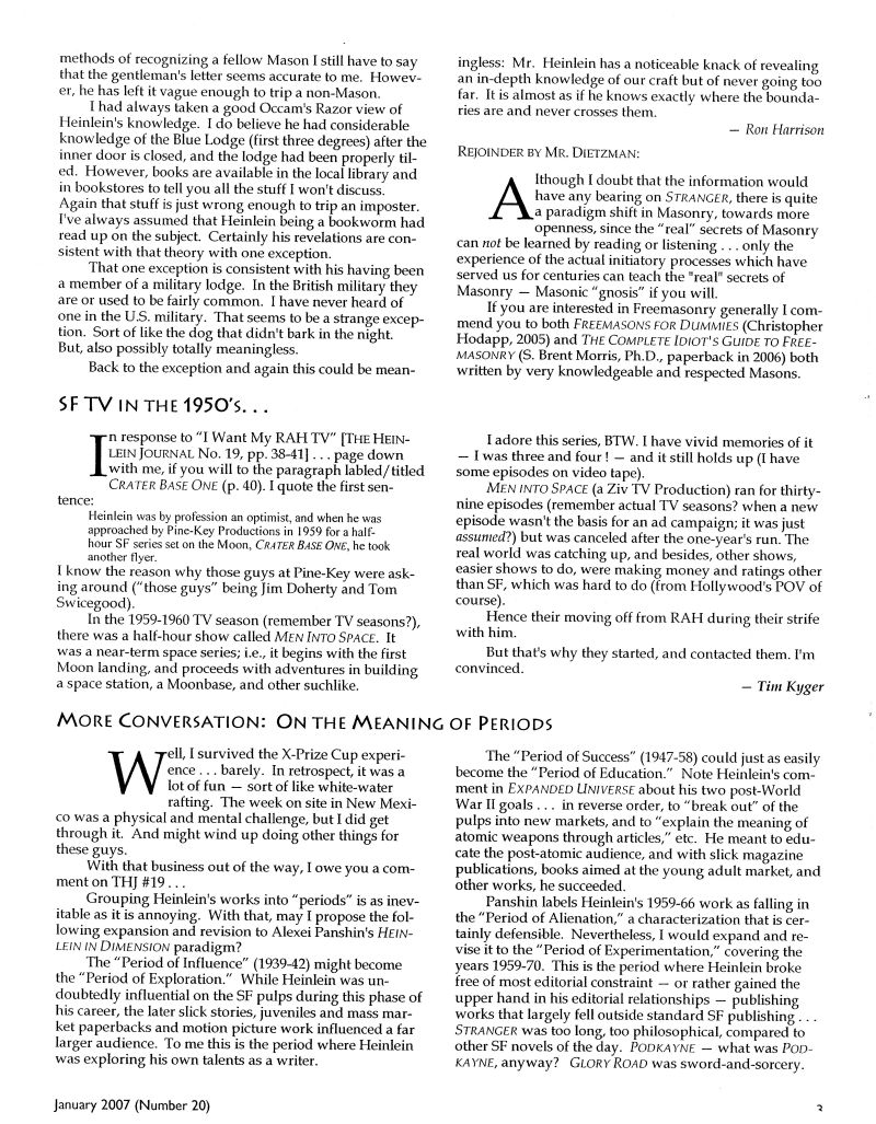 “Masonic References in Stranger.”– Dale Dietzman, with commentary by Ron Harrison; “SF TV in the 1950’s” — Tim Kyger; “More Conversation: On the Meaning of Periods” — Michael Cassutt; “A Correction” — Anonymous by Request; “More on Periods in Heinlein” — Tim Kyger; “Another Conversation — A Further Look at I Will Fear No Evil” — Charles Martin; “Reader Reaction Erratum” — Bill Patterson