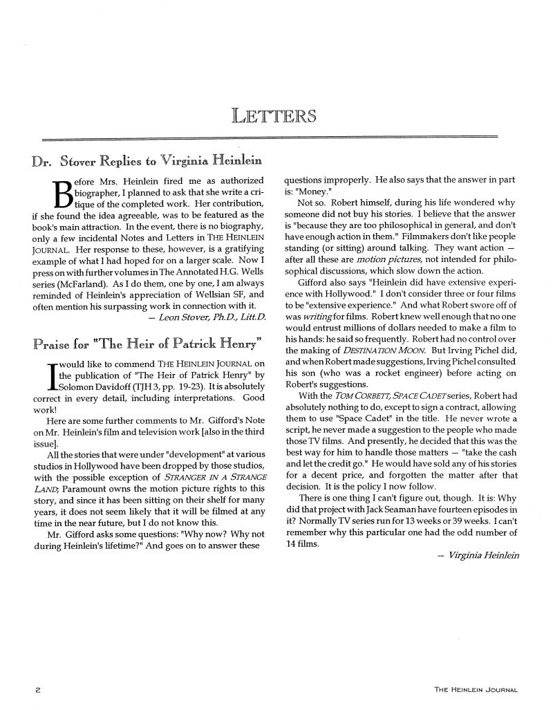 Letters: Leon Stover, Virginia Heinlein