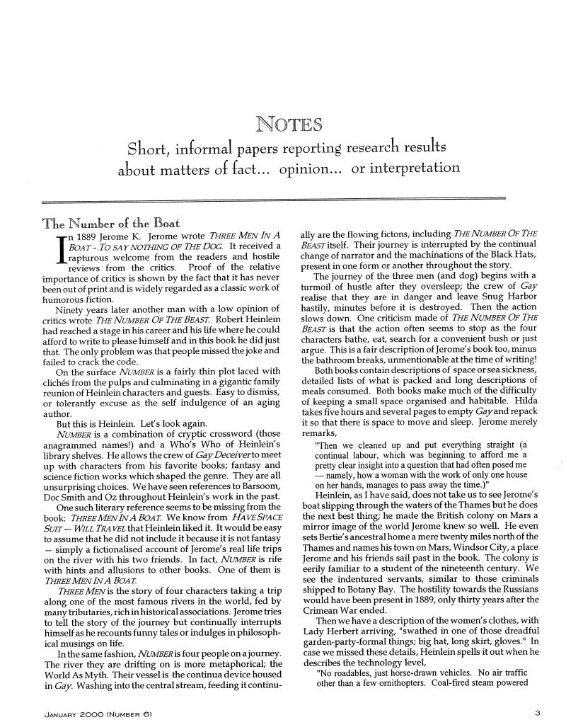 Jane Davitt: “The Number of the Boat”; Edward M. Wysocki, Jr., Ph.D.: “Even More on Names”; Bill Patterson: “Early Chronology of STRANGER”; Robert Gorsch: “Heinlein in Top 100s”; John C. LeGere: “Wells, Dunne, Heinlein”