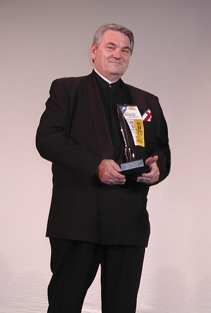Bill Patterson, author of the two-volume biography of Robert A. Heinlein, accepts the Retro Hugo on behalf of Heinlein, in 2001.