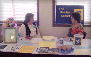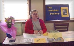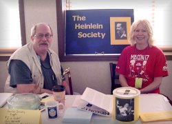 Last Day Of The Con: Don’t blow off the last day. Many fans attending the con are stingy with their money the first couple of days, by the end of the con they are getting tired and generous. Continue your presence at least until the dealer room closes. But What Do I Say? The Heinlein Society has an excellent website and everything they stand for is listed on the site. Read it, read it again, mull it over and make it your own. This is much better than having a rote speech written down. Just talk to folks, find out what their first Heinlein book was; what does Heinlein mean to them? One fellow was talking about his relationship with Heinlein; and I found out later it was David Gerrold …
